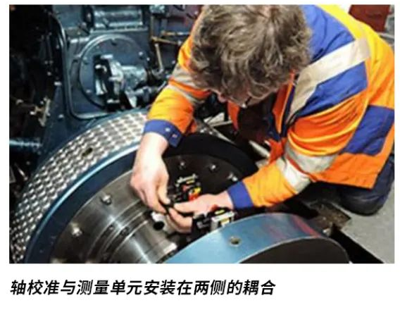 轉動軸與主機或變速箱的對中是通過軸對中設備進行的,軸對中設備的測量裝置安裝在聯軸器兩側。測量裝置使用鏈托架安裝在軸或聯軸器周圍,或使用堅固的磁鐵底座。在某些情況下,其中一個測量裝置可以代替放在電機的飛輪上。Easylaser的測量程序可以測量只需要40°旋轉的軸。測量結果顯示如何使用墊片調整電機得到精準對中,且使用實時數值調整到正確的位置。